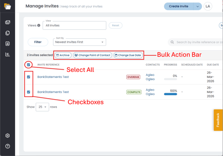 Archive, reassign, and update due dates across multiple Invites at once.