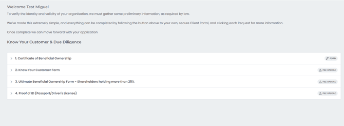 On the left side, clients see a list of requested documents. Clicking the Open link for any document shows specific instructions.