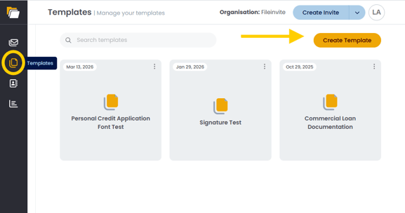 To create a template from scratch, click the Templates icon in the left sidebar, then click Create Template in the top-right corner of the Templates page.