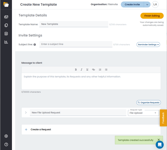 Learn how to create and configure a template in FileInvite. Templates let you define a reusable set of document requests, messaging, and settings so every Invite you send starts from a consistent, ready-to-use structure.
