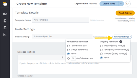 - Ongoing Reminder — sends recurring reminders until the Invite is completed or manually stopped. Options: Weekly (every 7 days), Fortnightly (every 14 days), Monthly (every 30 days), or Never (default).