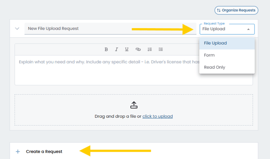 A default New File Upload Request is included automatically. Click the arrow to expand it and update the name, type, and instructions as needed.