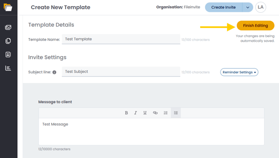Changes are saved automatically as you work — you will see "Your changes are being automatically saved." confirmed in the top-right corner of the page. When you have finished configuring the template, click Finish Editing to return to the Templates page.
