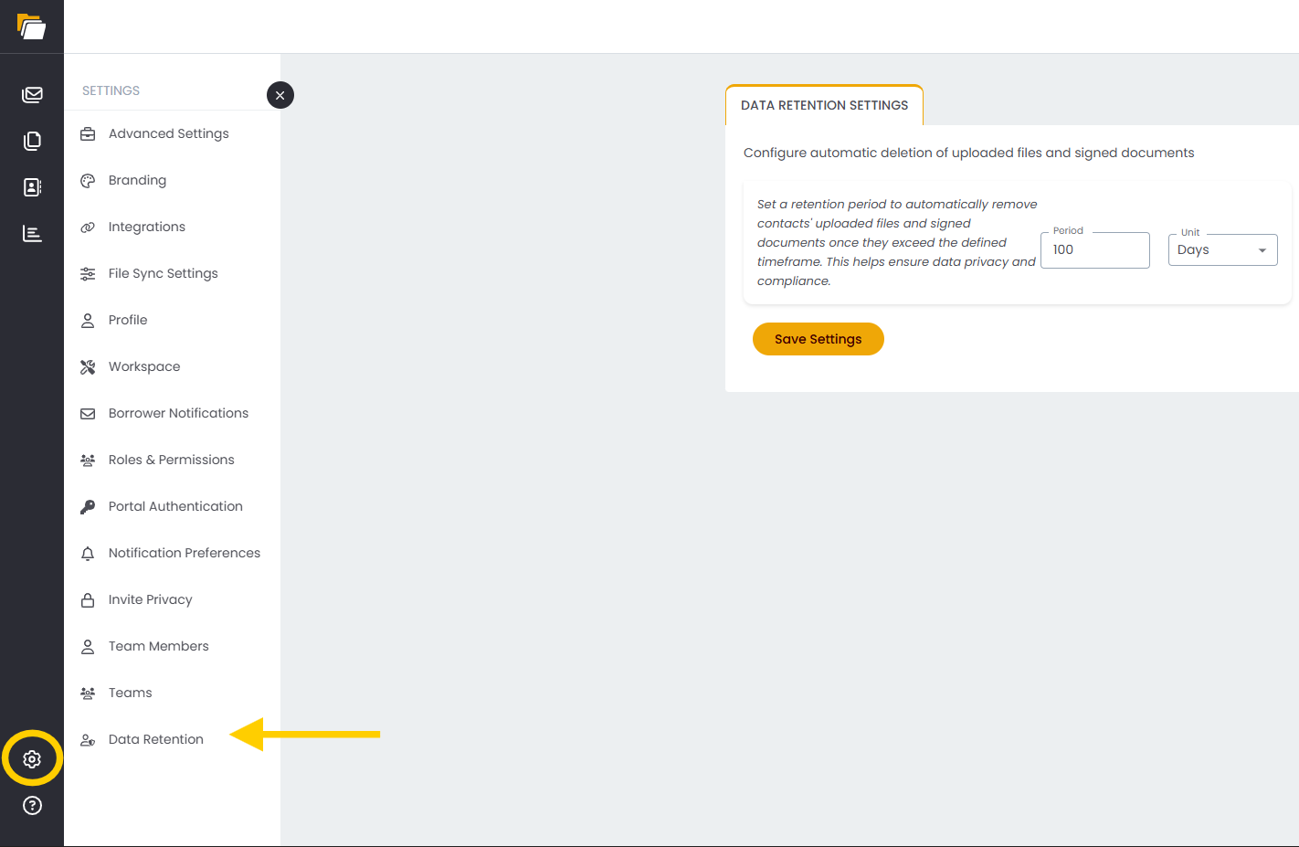 Click Save Settings to activate your data retention policy. The system will begin tracking uploaded files against your configured schedule.