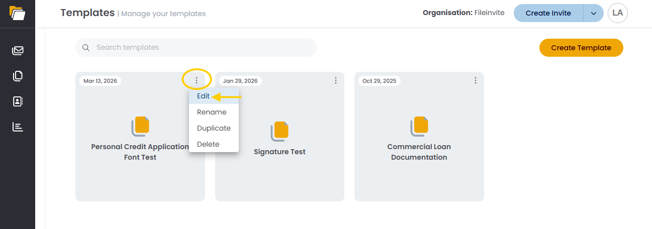 To get started, click Templates along the left to bring up the templates list, then click the 3 dots at the top right of the template you'd like to modify to bring up the Edit, Rename, Duplicate, and Delete options.