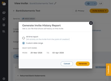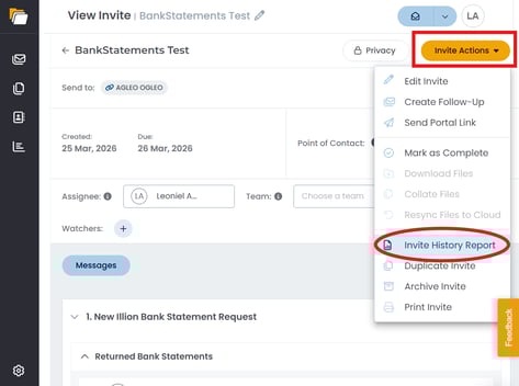 Learn how to generate a history report for any Invite. The Invite History Report lets you export a complete record of everything that has happened on an Invite — uploads, document status changes, assignee updates, and more — as a CSV file delivered to your email.
