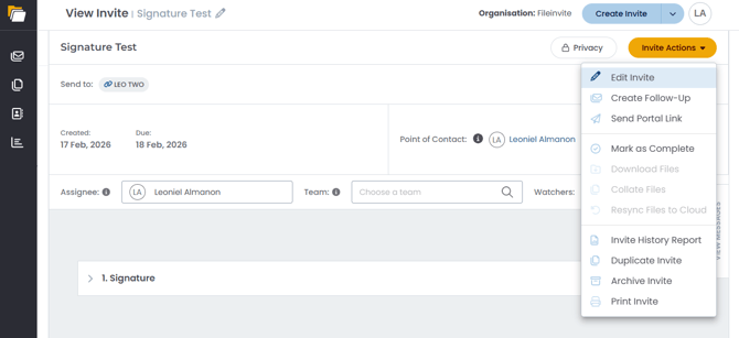To change the Point of Contact for an invite, open the invite and click Edit Invite under Invite Actions