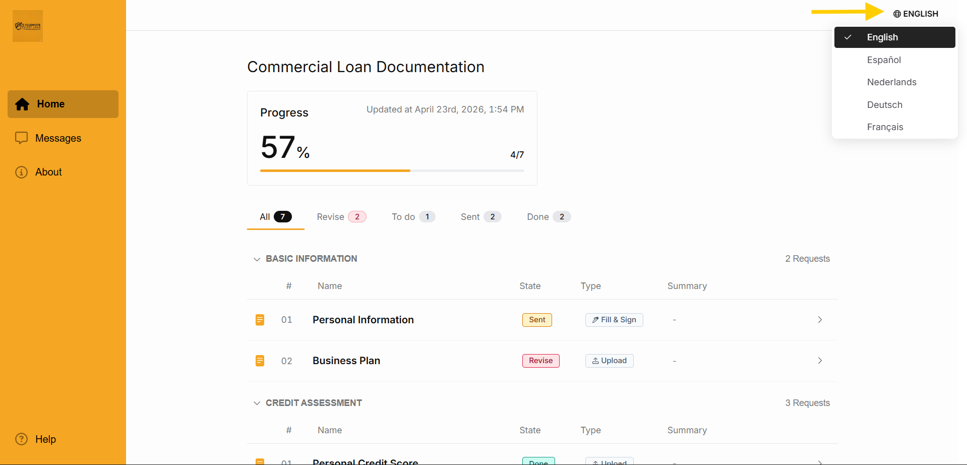 Borrowers can switch language at any time directly from the Client Portal without any action required from the sender.