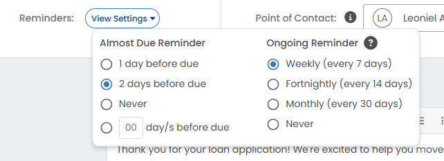 💡 Best Practice: For Invites with no due date, set a reminder frequency that balances persistence with borrower experience — weekly reminders are a common starting point.