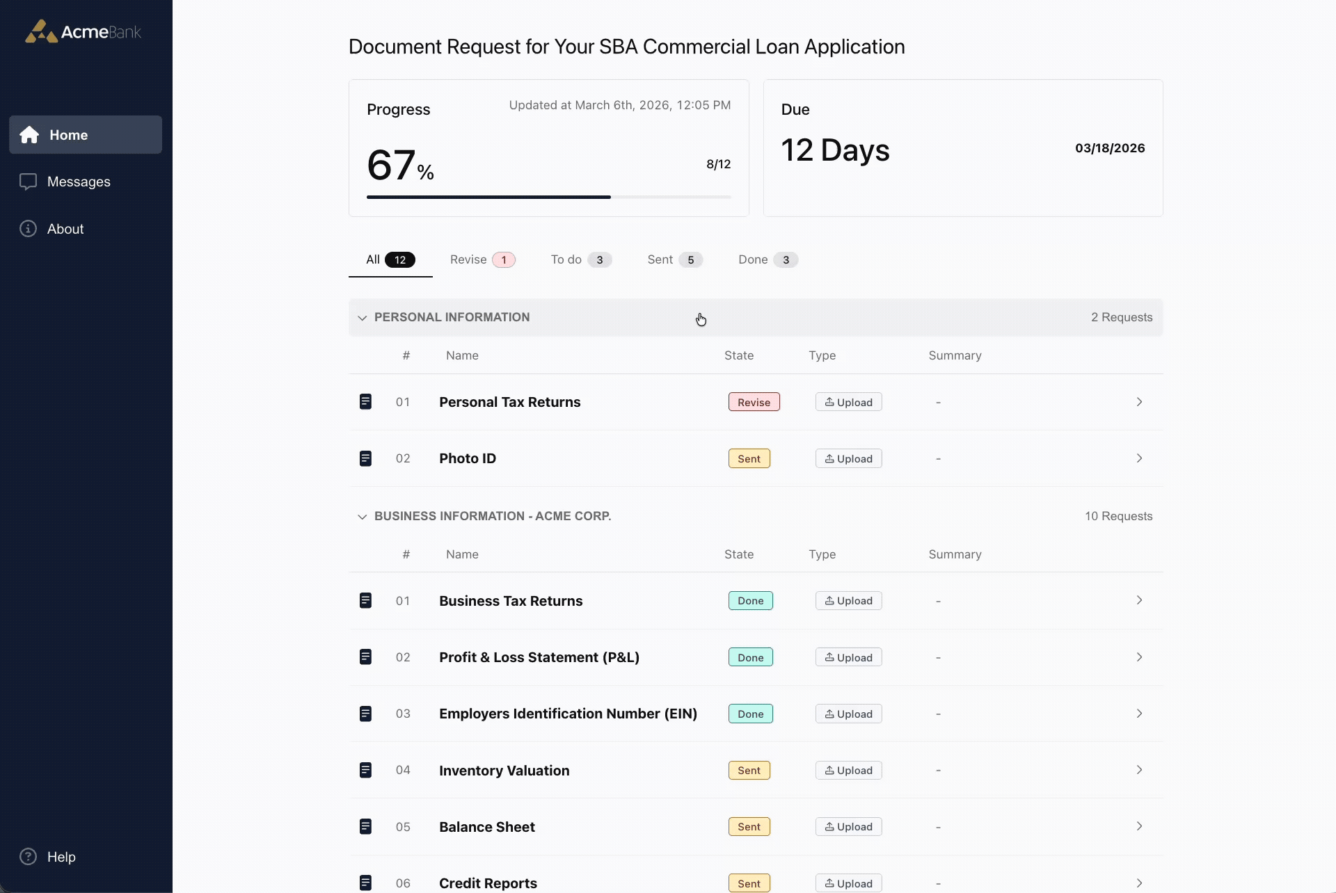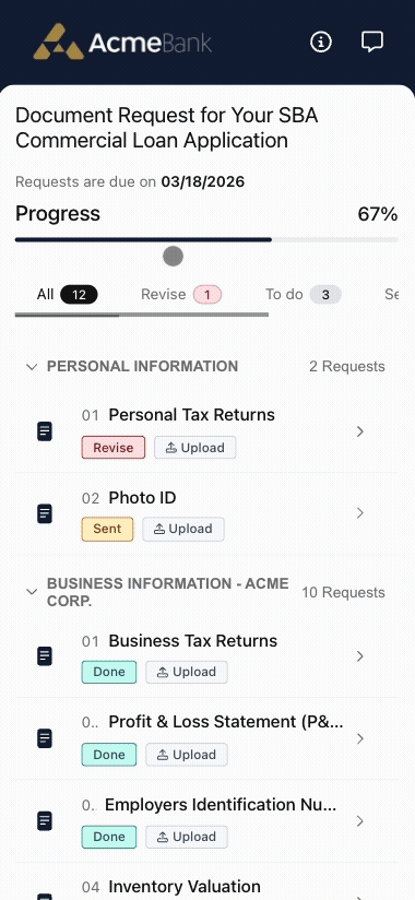 Borrowers can see at a glance what's left to do, what's been submitted, and what's been accepted or needs revision.