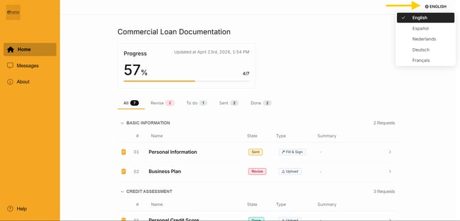 The portal selects a language automatically based on the borrower's browser language if it matches one of the supported languages. For full details, see Multi-Language Support in the Client Portal.