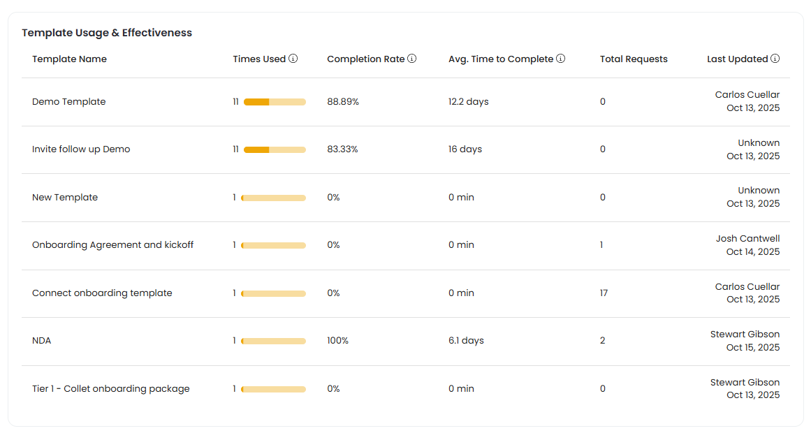 💡 Optimize high-usage templates: Templates with lower completion rates or longer completion times may benefit from simplification or clearer instructions